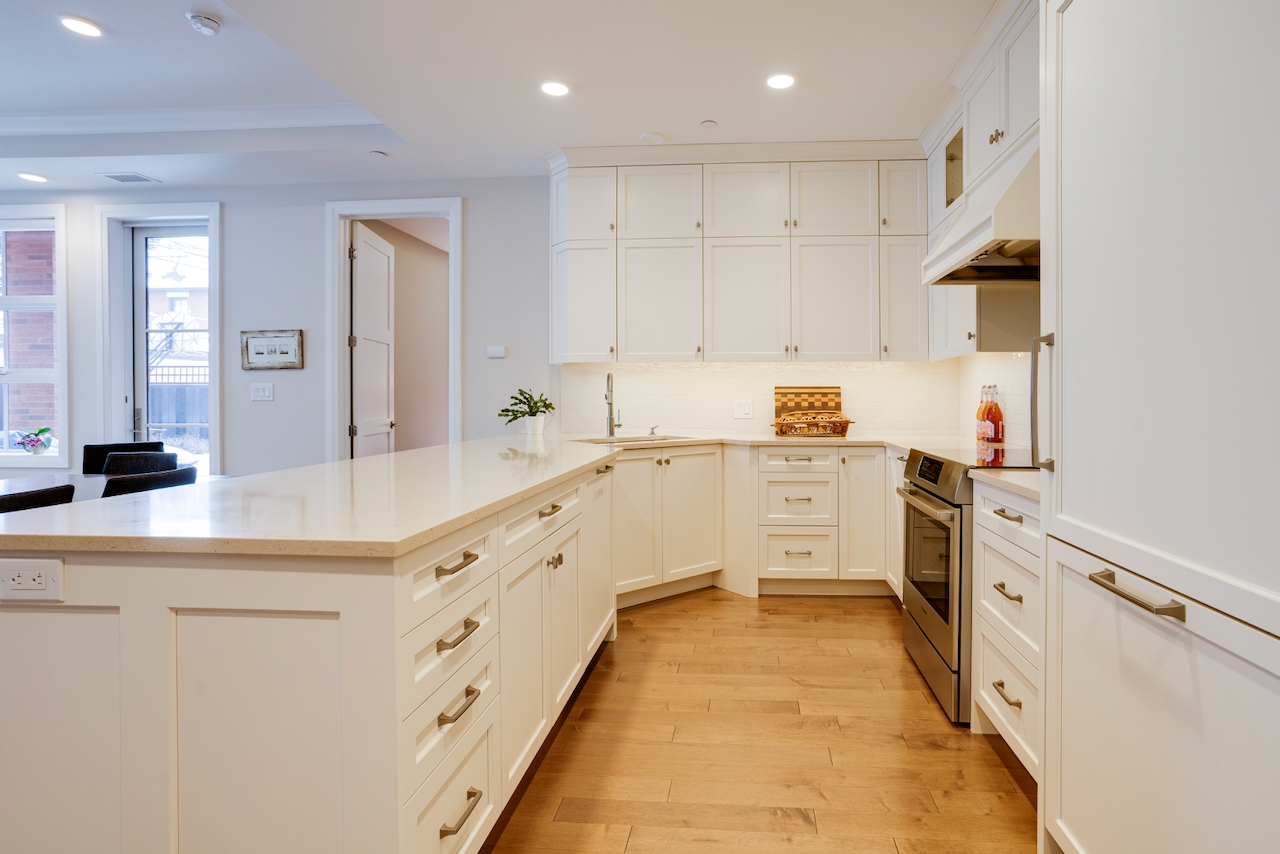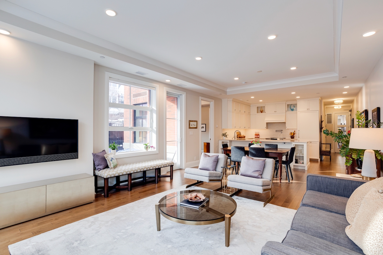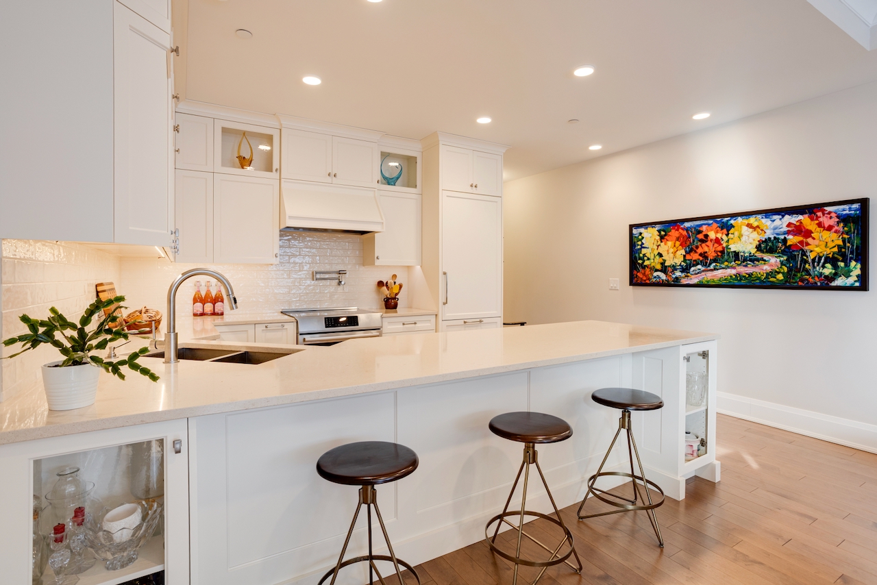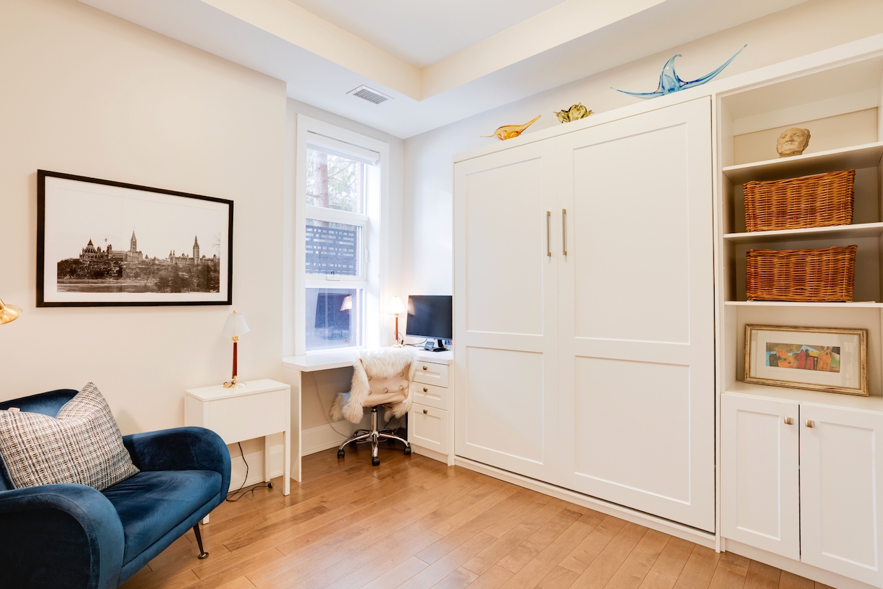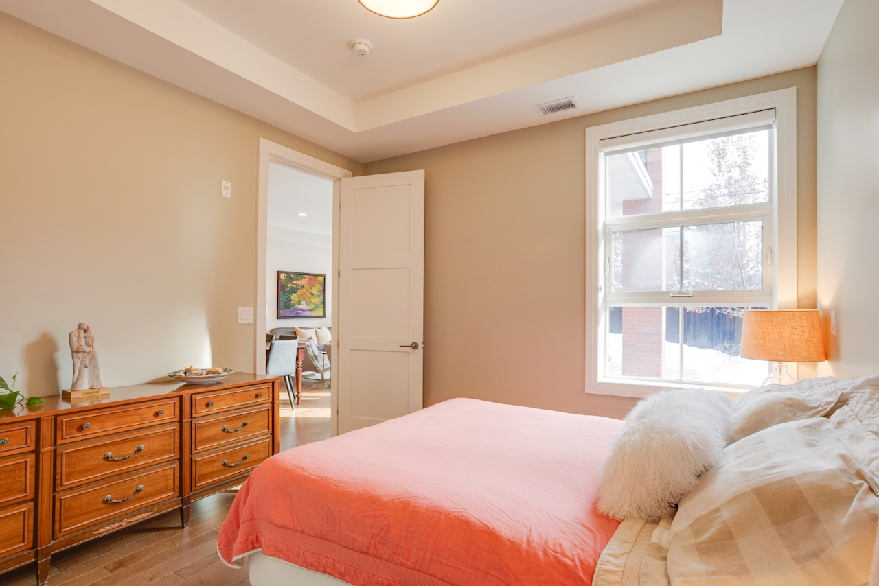 174 Glebe Avenue stands in a class of its own. Unlike most urban condos, this boutique low-rise is set back from the bustle of the main street, offering a peaceful residential setting with ample on-street parking for guests. This exceptional ground-floor suite features beautifully scaled living spaces with 10-foot ceilings, rich hardwood floors, and a striking central gas fireplace framed by tall windows. The elegant, high-quality kitchen, with quartz counters, is thoughtfully designed with generous counter space and cabinetry, an overhang for seating, and glass showcase cabinets. The bathrooms feature granite countertops and heated floors.