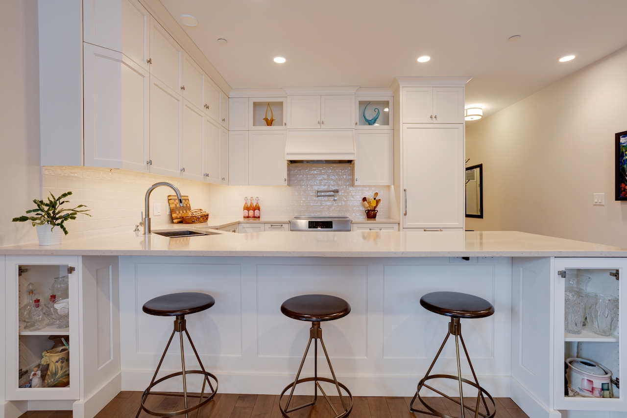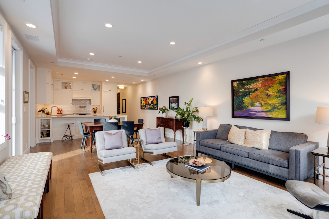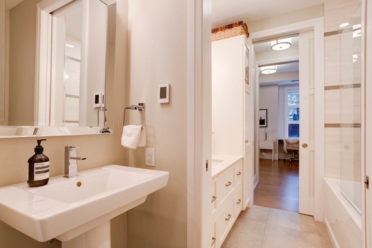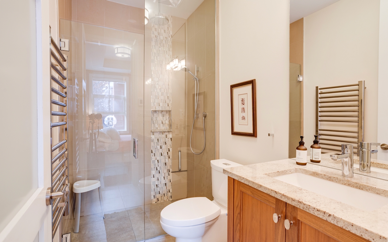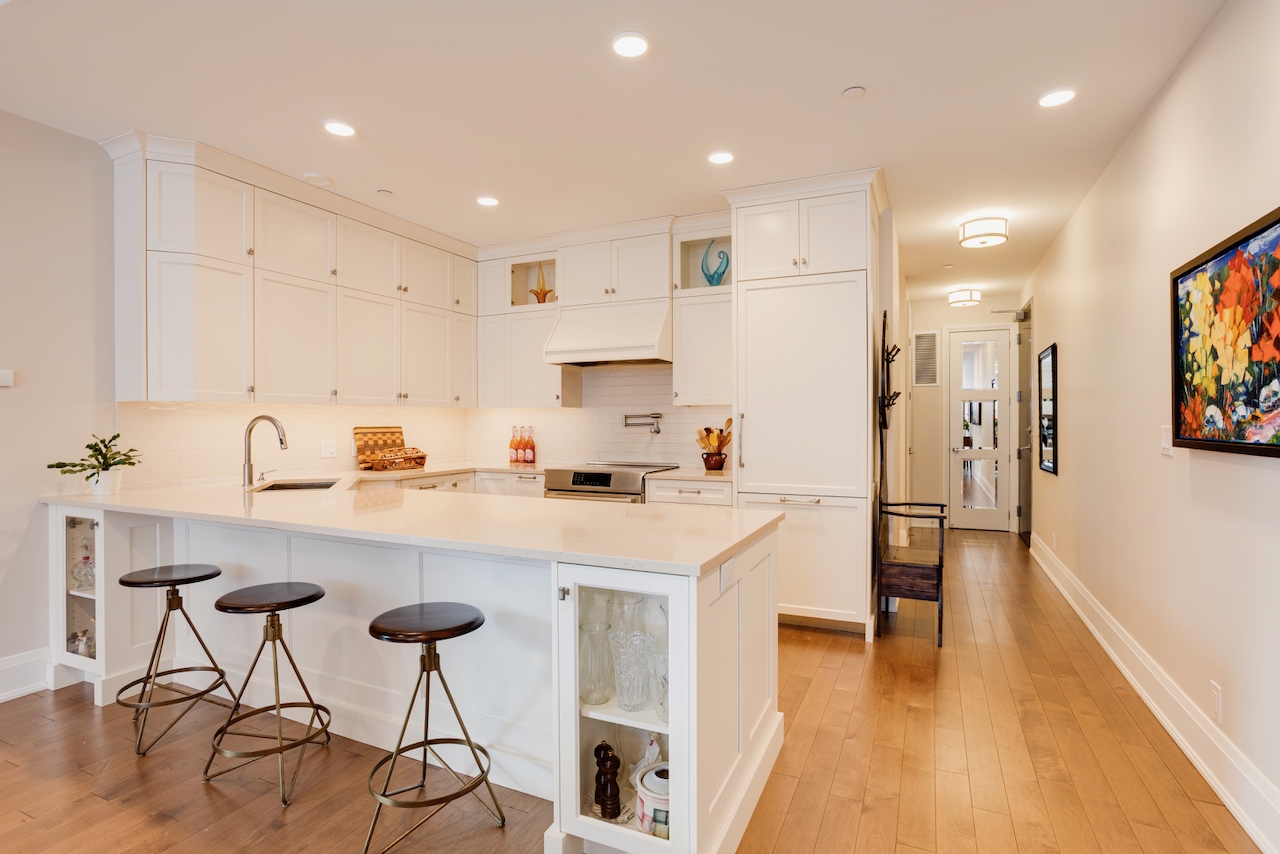 174 Glebe Avenue stands in a class of its own. Unlike most urban condos, this boutique low-rise is set back from the bustle of the main street, offering a peaceful residential setting with ample on-street parking for guests. This exceptional ground-floor suite features beautifully scaled living spaces with 10-foot ceilings, rich hardwood floors, and a striking central gas fireplace framed by tall windows. The elegant, high-quality kitchen, with quartz counters, is thoughtfully designed with generous counter space and cabinetry, an overhang for seating, and glass showcase cabinets. The bathrooms feature granite countertops and heated floors.
