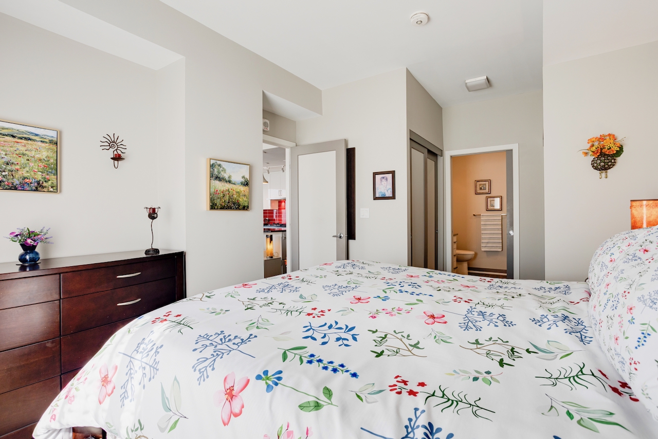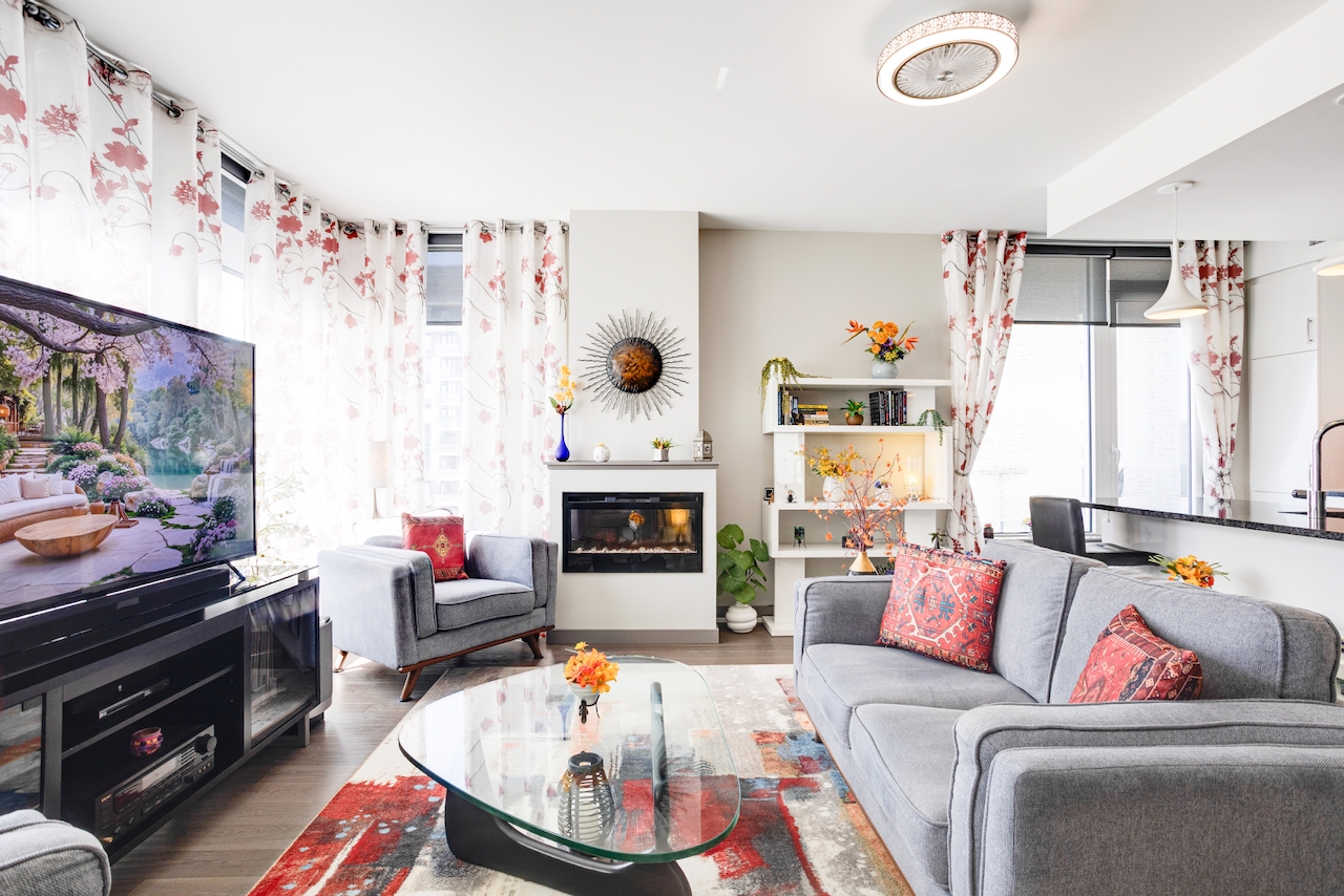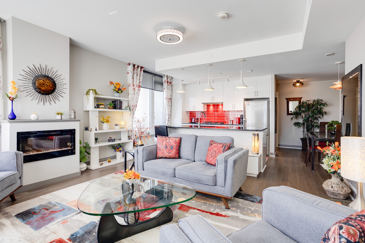 This sun-filled west facing corner suite (1,096 sq. ft.) instantly captivates with a spacious living area, generous bedrooms, and ample closets. The stunning kitchen boasts granite counters, a large centre island with under counter seating, and a gas stove. The living area is anchored by a stylish fireplace, perfect for both relaxing and entertaining. Decorated with style and personality, featuring smoke oak wood flooring, custom window treatments and designer light fixtures. Gas BBQ outlet on balcony. Pet-friendly and thoughtfully designed for comfortable, easy living. Parking #34 Level P2. Locker 08 Level P2.