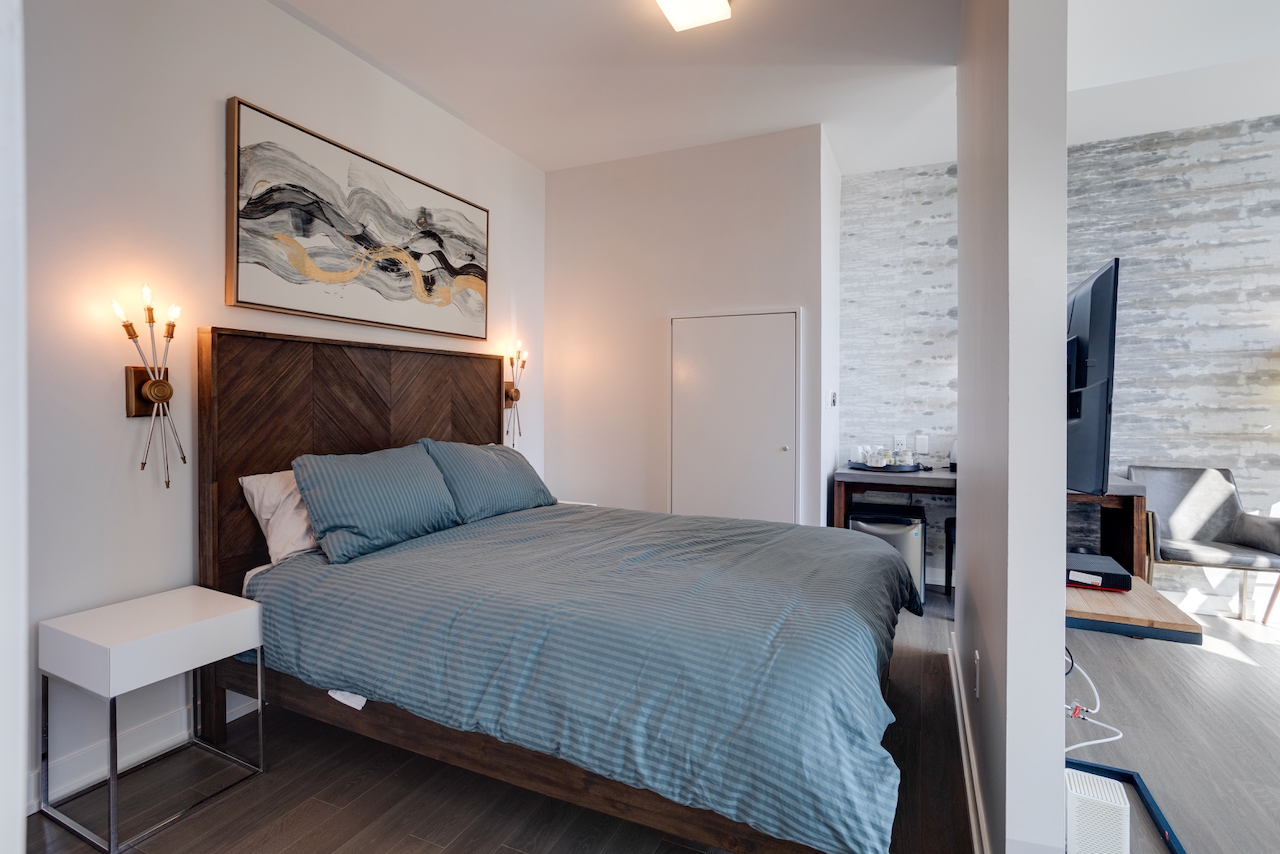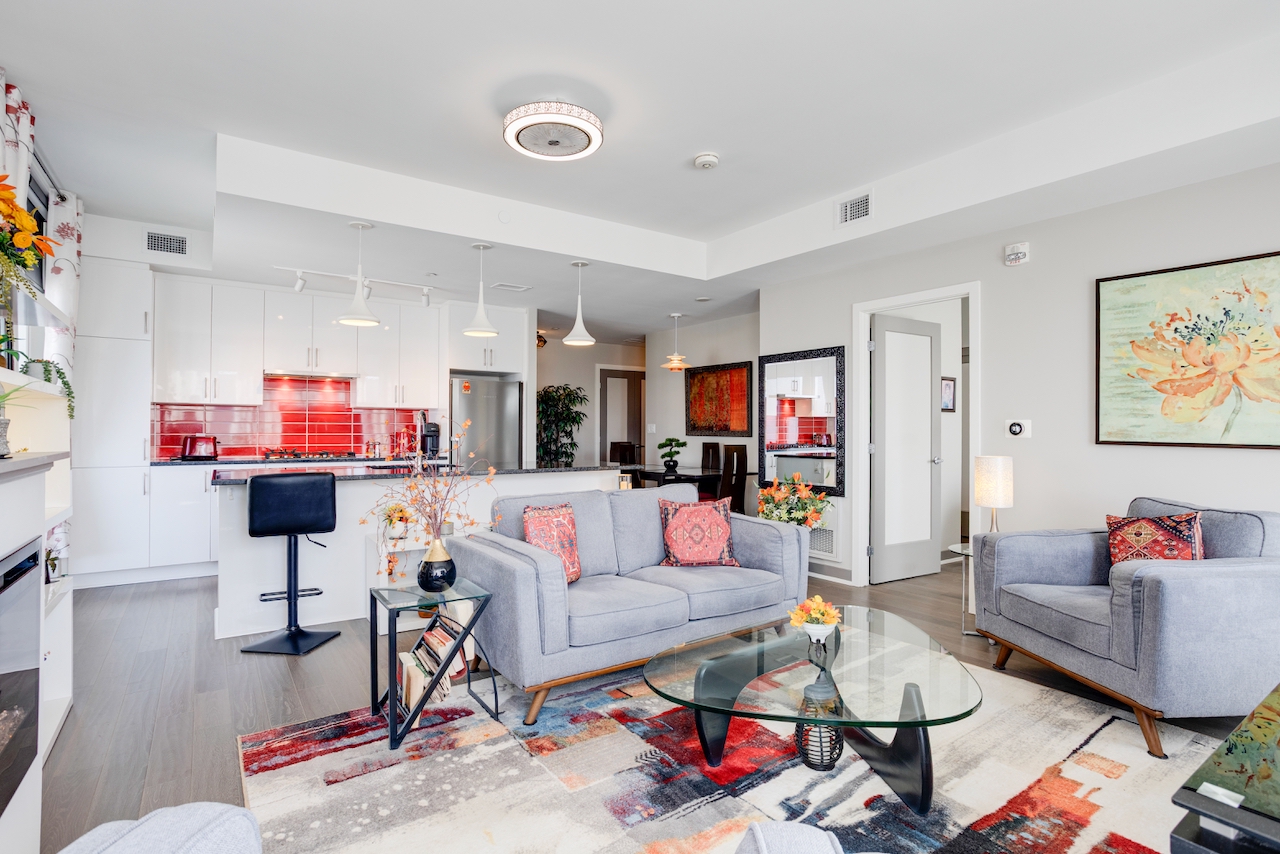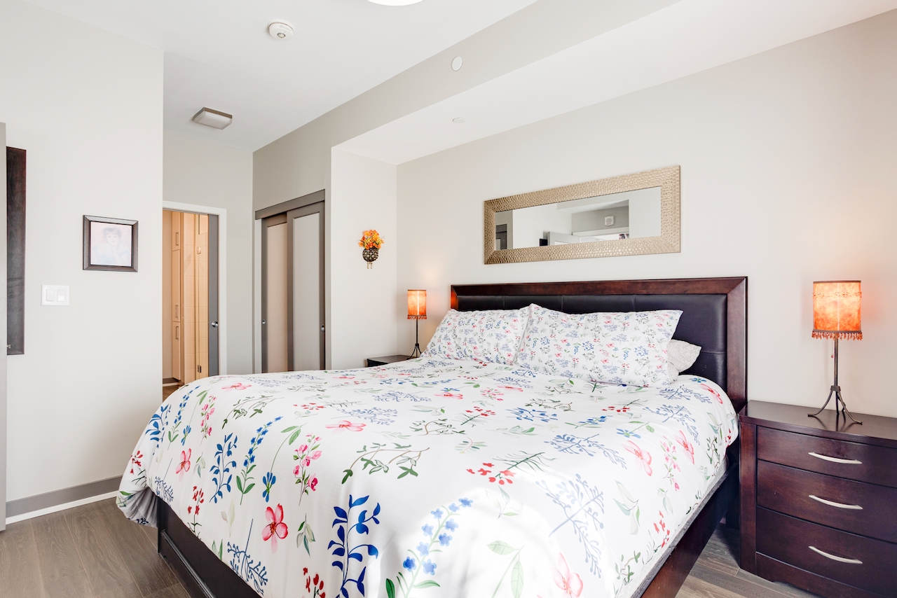 This sun-filled west facing corner suite (1,096 sq. ft.) instantly captivates with a spacious living area, generous bedrooms, and ample closets. The stunning kitchen boasts granite counters, a large centre island with under counter seating, and a gas stove. The living area is anchored by a stylish fireplace, perfect for both relaxing and entertaining. Decorated with style and personality, featuring smoke oak wood flooring, custom window treatments and designer light fixtures. Gas BBQ outlet on balcony. Pet-friendly and thoughtfully designed for comfortable, easy living. Parking #34 Level P2. Locker 08 Level P2.