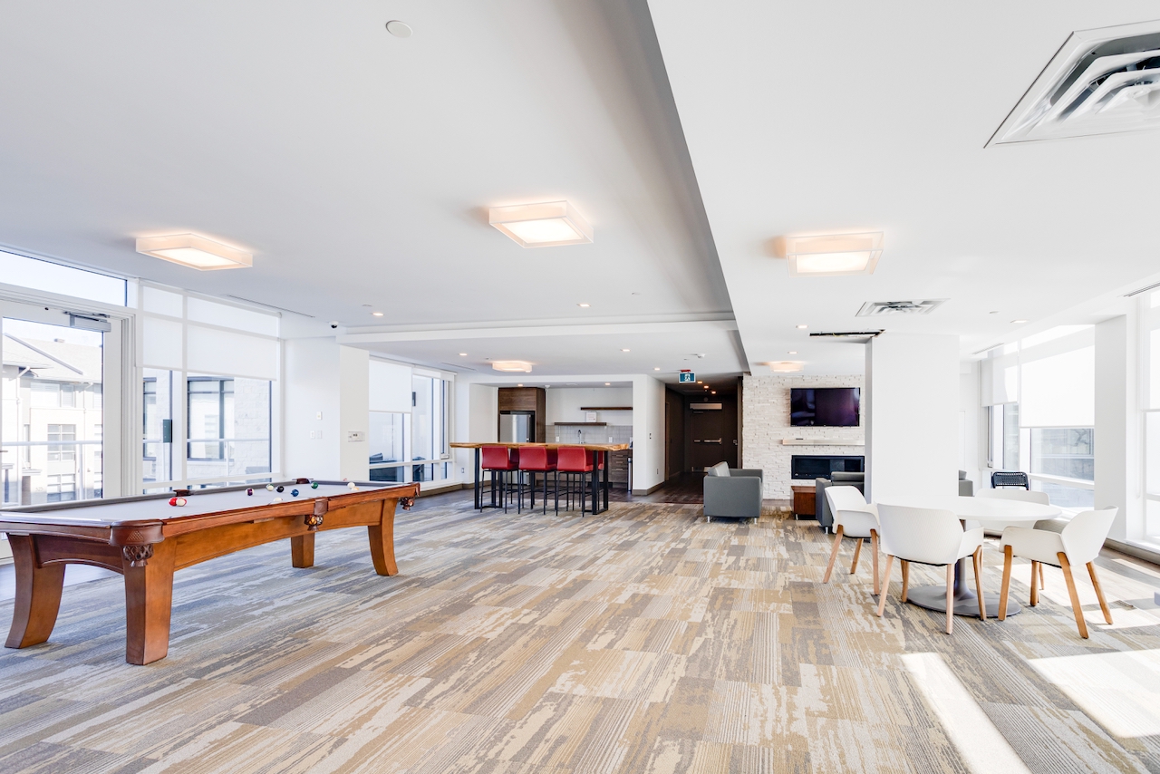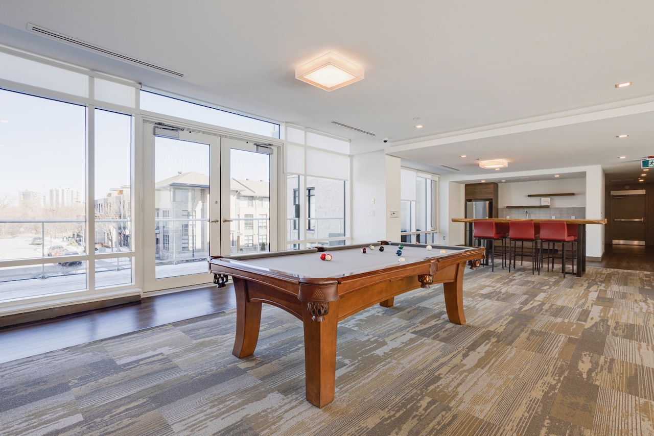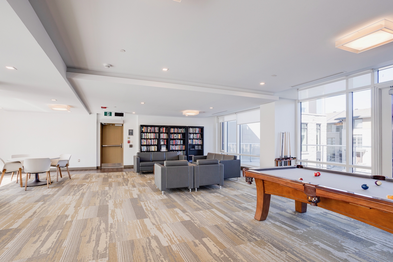 Outstanding amenities foster a strong sense of community and include a sun-filled second-level lounge with floor-to-ceiling windows, outdoor terraces, fireplace, billiards, kitchenette, and large-screen TV; a fully equipped fitness room and yoga studio; and a grand main-floor lounge with formal dining, seating areas, and full kitchen for large-scale gatherings. A community calendar keeps social life engaging for those who wish to participate. The bright main-floor guest suite features high ceilings, and visitor parking is also available for rent. Additional features include wheelchair-accessible washrooms, a car wash bay, dog wash, and bicycle storage.